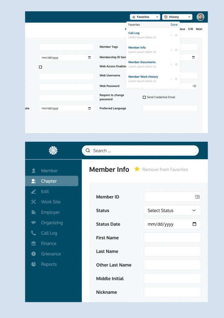 Our team introduced new features based on customer feedback that would make the application easier to use, including a Favorites and History function. The favorites tab at the top right is completely customizable per user and allows them to bookmark any app functions like membership info, reports, worksite info, etc. The History function kept a record of previous pages visited by the user allowing the user to backtrack if needed.